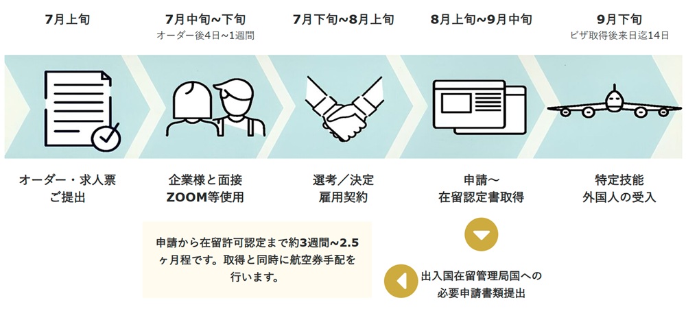 外国人材の採用を検討する企業様にとって、特定技能制度は即戦力の確保だけでなく、申請や手続きの面でも導入しやすい仕組みです。「手間をかけずに、必要な人材を確実に確保したい」という企業様にとって、特定技能は非常に有効な選択肢となります。