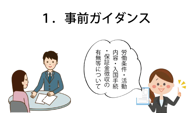 雇用契約締結後、在留資格認定証明書交付申請前又は在留資格変更許可申請前に、労働条件、活動内容、入国手続、保証金徴収の有無等について対面・テレビ電話等で説明します。