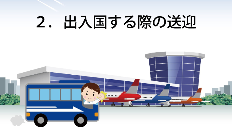入国時に空港等と事業所又は住居への送迎を行います。帰国時に空港の保安検査場までの送迎、同行を行います。