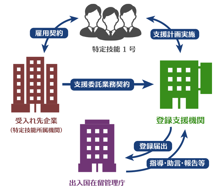 特定技能外国人が不当な扱い受けないようチェックし、また外国人本人が何かあった際に連絡できるよう補助するものです。